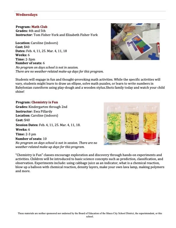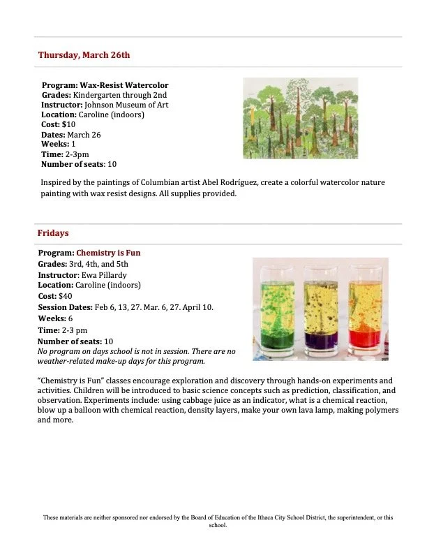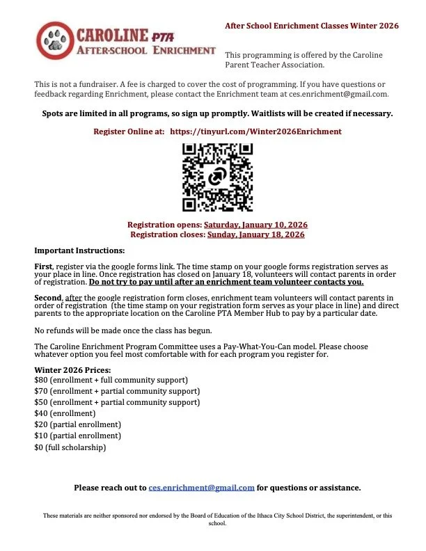 After school enrichment programs are coordinated and run by parent volunteers, through the Caroline Activities Team (not the school district).  Enrichment programs vary from session to session.  Most programs run from 2-3pm, right after school, for six weeks.  There are 3 enrichment sessions each school year: Fall (October - November), Winter (February - March), and Spring (April - May).
